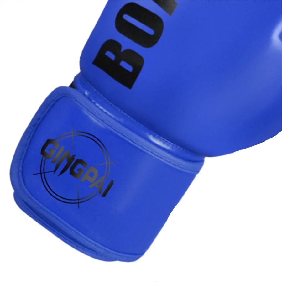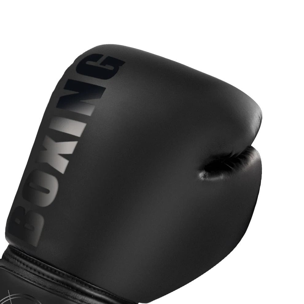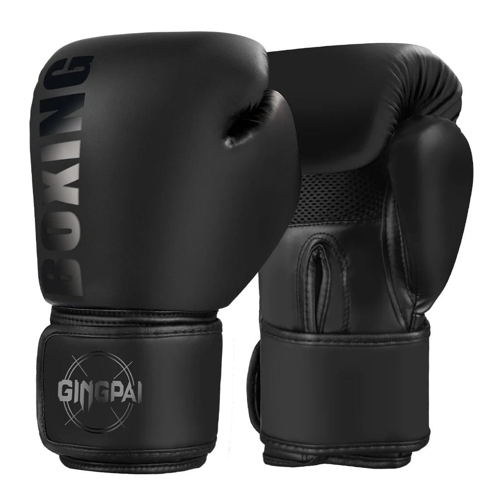 Gants de boxe noirs avec inscription dorée "BOXING" et logo "GINGPAI".